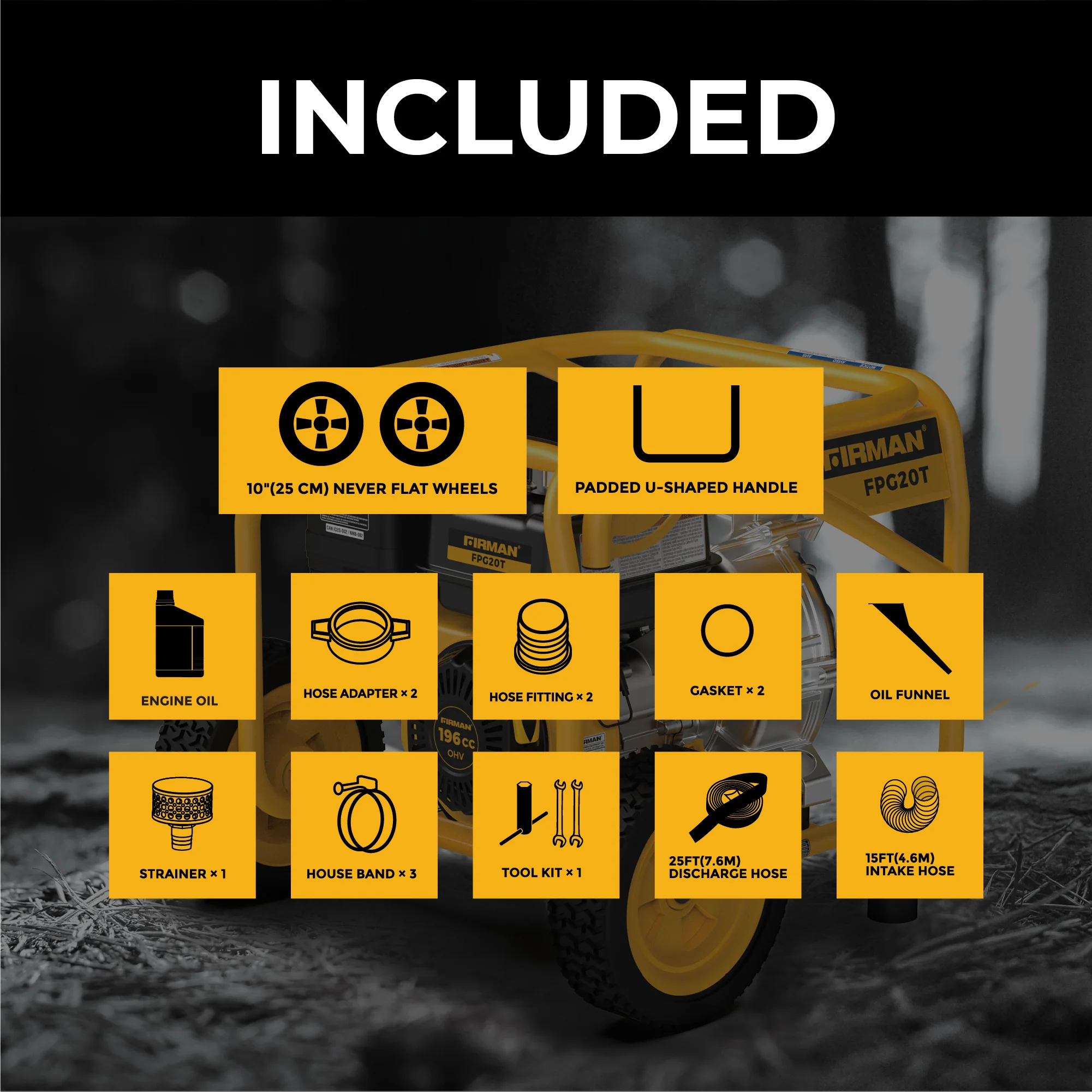 The FPG20T comes with an engine oil bottle, oil funnel, tool kit, 25-foot discharge hose, and 15-foot intake hose.