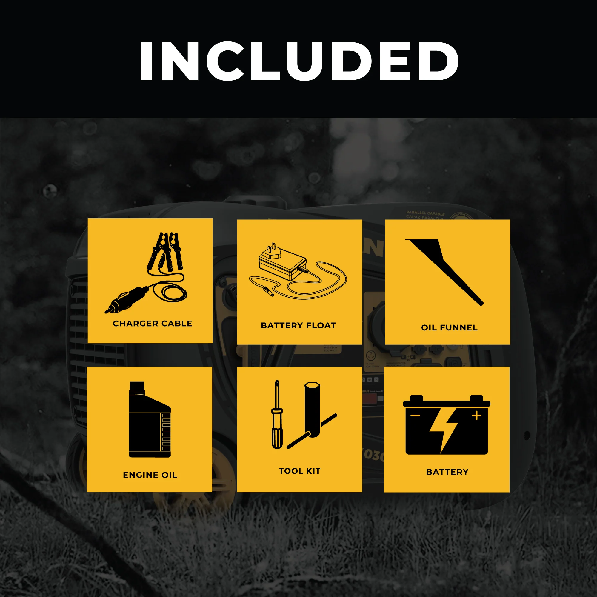 The W03082 comes with an engine oil bottle, oil funnel, spark plug wrench, screwdriver, 12V battery cable, floater charger, and quick oil drain.