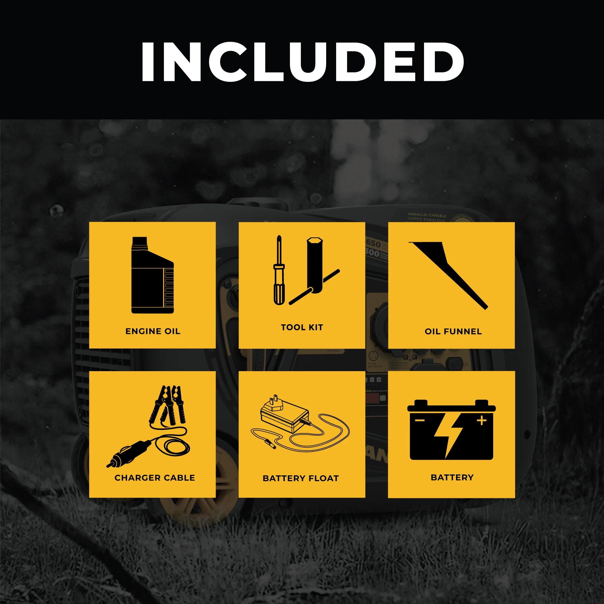 Every W03382 comes ready to run with engine oil, oil funnel, spark plug wrench, screwdriver, 12V battery cable, floater charger, and quick oil drain included in the box.